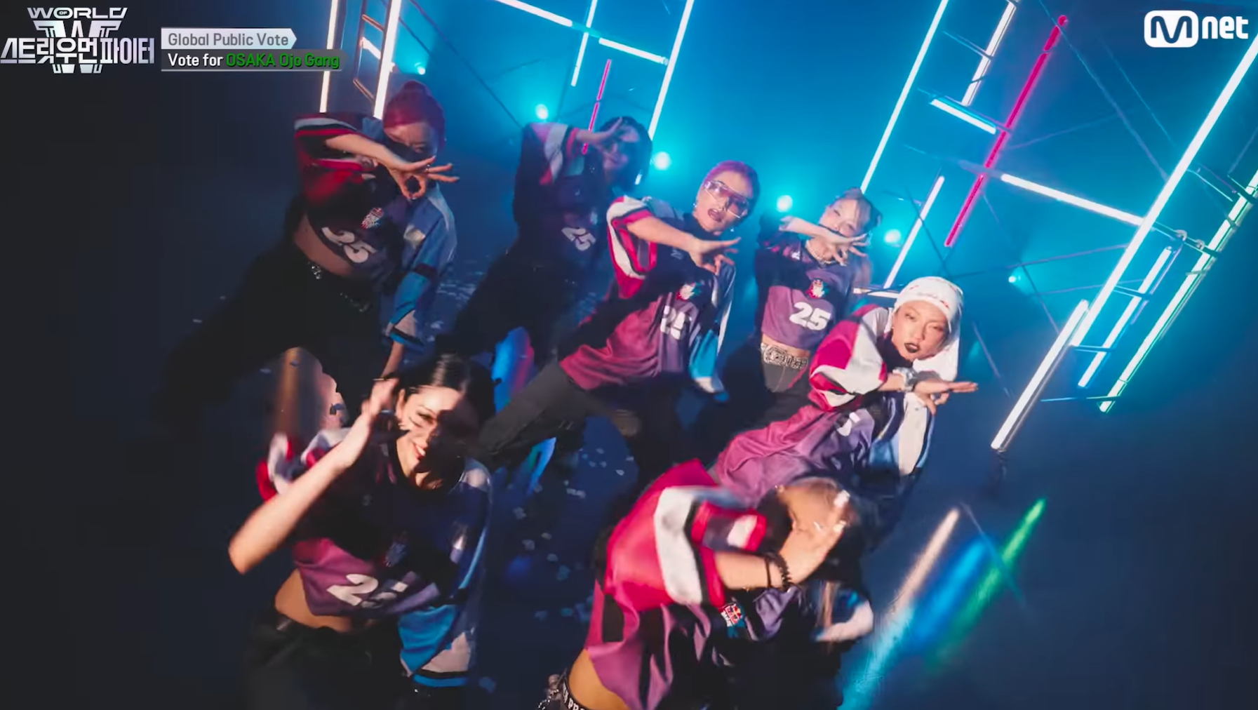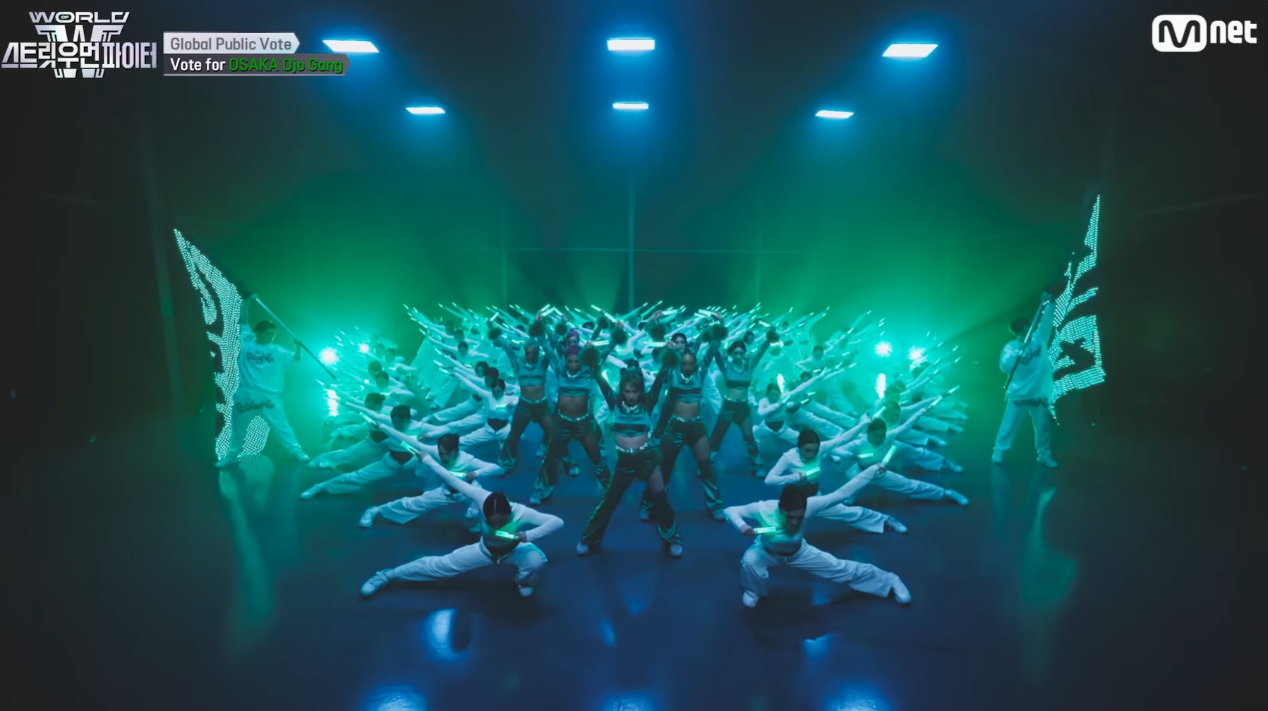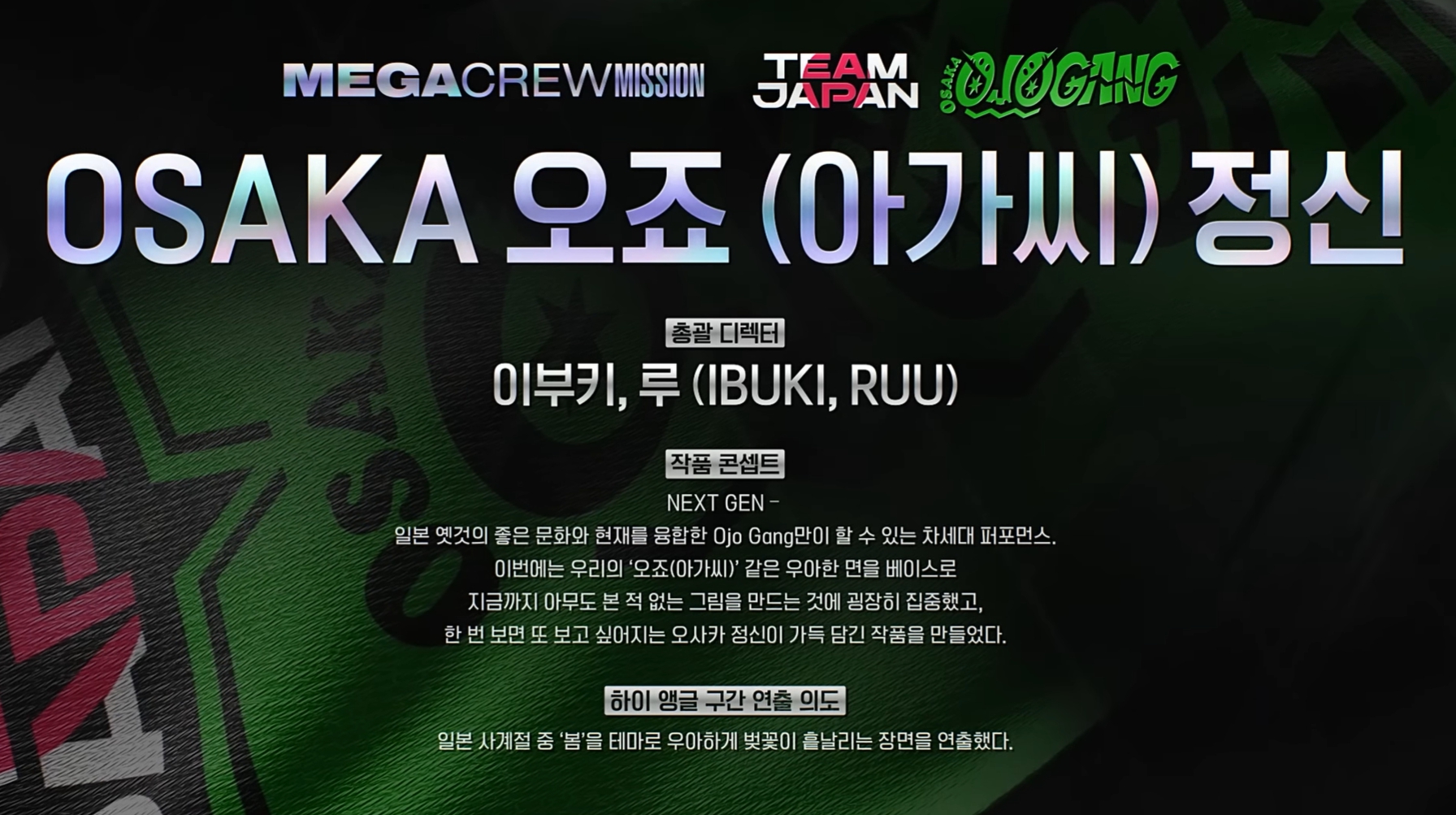 - 감상평: 무대는 시작부터 강렬한 에너지로 시선을 사로잡으며 전체적인 분위기를 주도했습니다. 그러나 중간에 트와이스가 등장하는 구간에서는 작품의 의도가 다소 흐려졌고, 오히려 팀 멤버들보다 트와이스가 부각되는 느낌이 있어 아쉬움이 남았습니다. 그럼에도 불구하고 전체적으로 높은 에너지와 강렬한 인상을 남긴 무대였으며, 일본의 고유한 문화인 ‘응원봉’을 활용한 안무는 해당 팀의 정체성을 잘 녹여낸 시도였다고 생각됩니다. 메가크루 미션의 장점을 살려 다인원 퍼포먼스의 웅장함과 폭발적인 에너지를 효과적으로 표현한 무대였습니다.