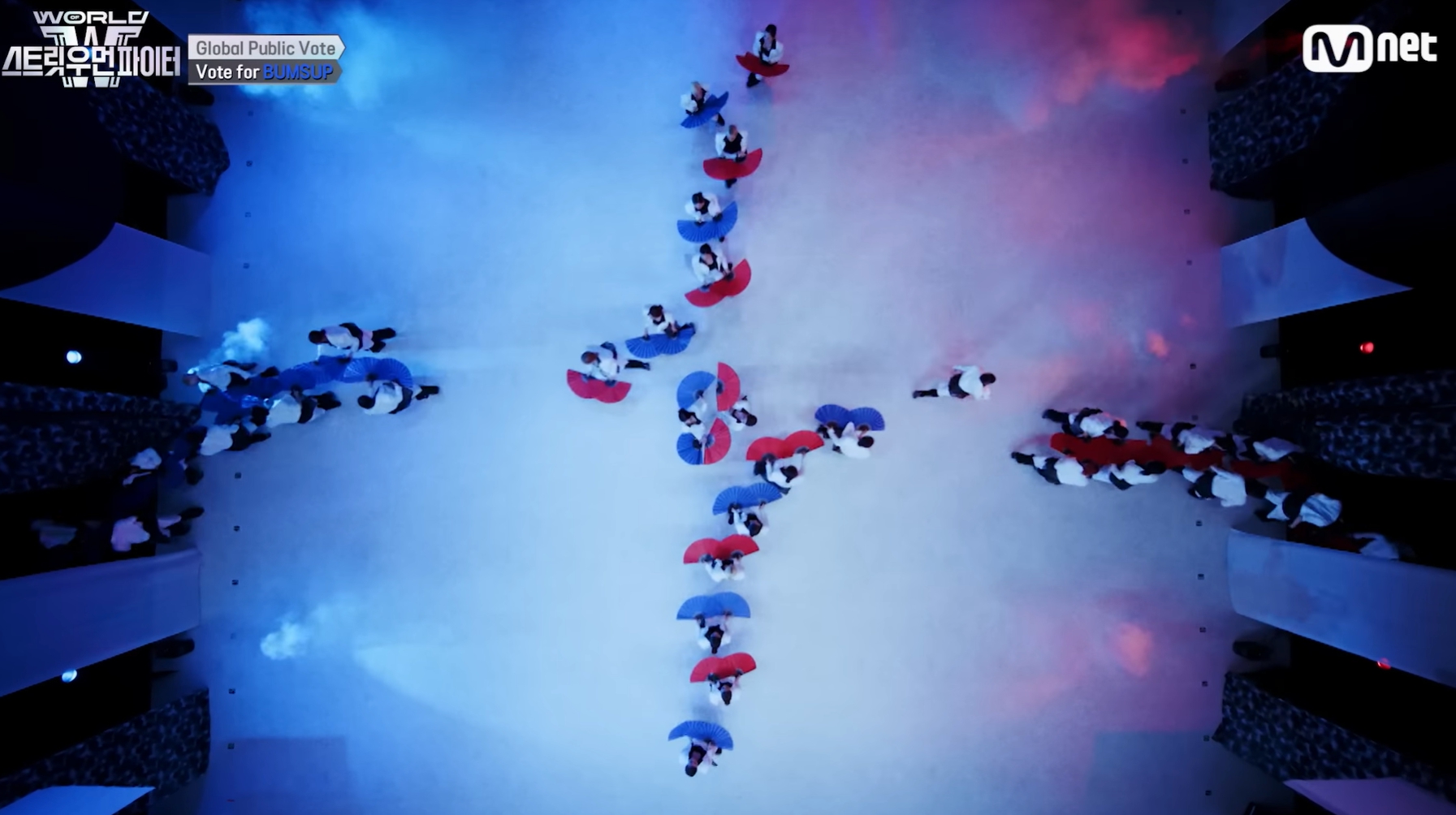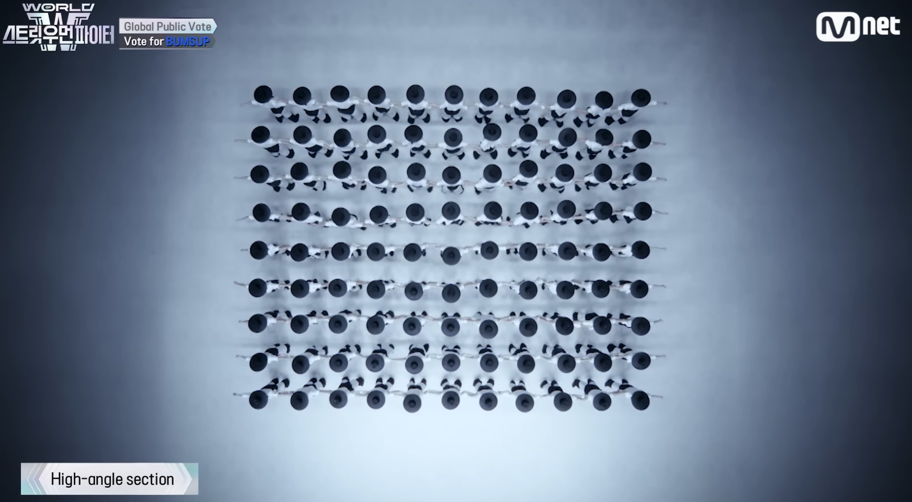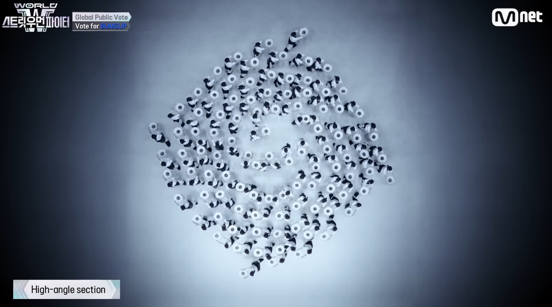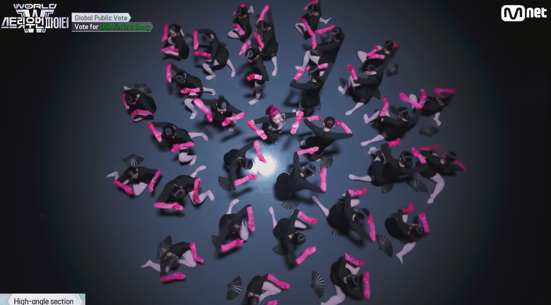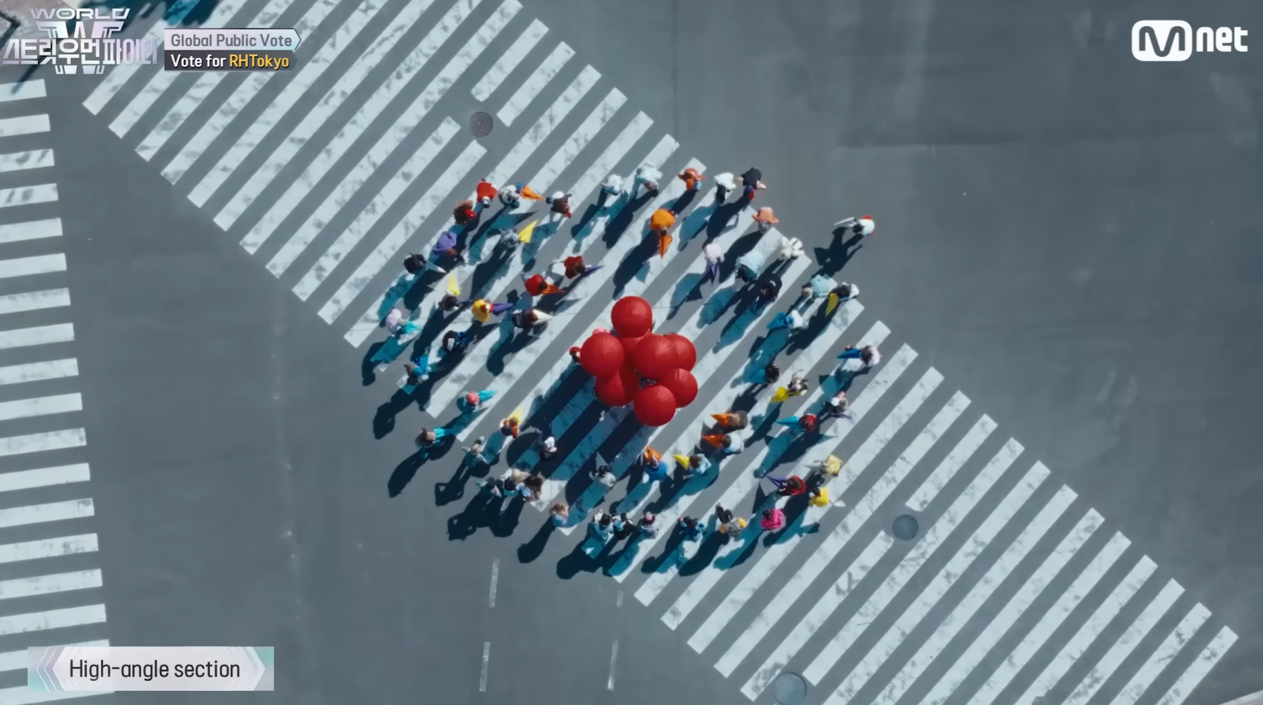 - 하이앵글: 카메라 상단 구도에서 외부촬영으로 인해 원형 퍼포먼스 구성이 다소 흐트러져보이나, 최종적으로 일본 국기를 완성해 의미 부여함