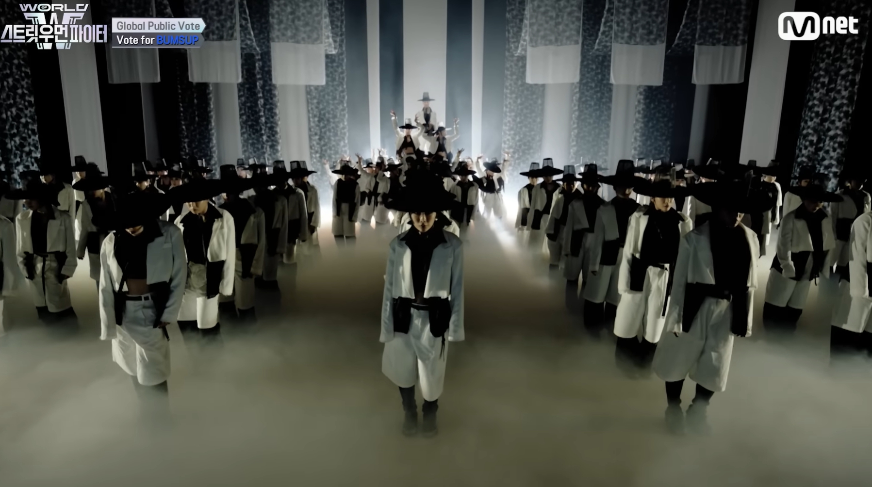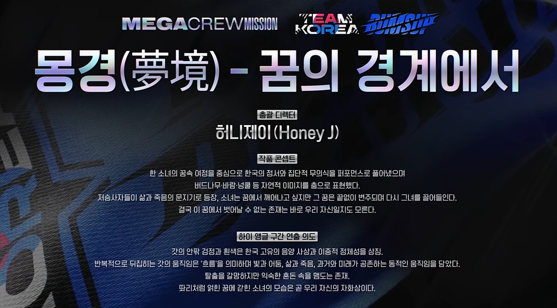 - 감상평:개인적으로 이번 무대는 매우 깊은 인상을 남긴 작품이었습니다. 강한 메시지를 담고 있는 한 편의 예술 작품처럼 느껴졌으며, 퍼포먼스 이상의 의미를 전달하는 무대였습니다. 영상미와 연출 모두 뛰어나 시각적으로도 몰입감이 높았고, 전체적인 구성에서 예술적 감성이 돋보였습니다.다만, 메가크루 미션의 핵심인 웅장하고 압도적인 스케일감은 다소 부족하게 느껴졌다는 점은 아쉬움으로 남습니다. 그럼에도 불구하고, 무대가 끝난 후에도 여운이 오래 남을 만큼 메시지 전달력이 강했던 퍼포먼스로, 다시 한 번 그 의미를 되새기게 만드는 힘이 있는 무대였다고 생각합니다.