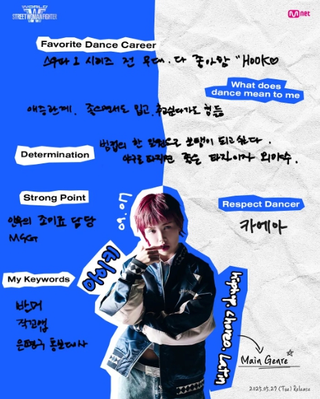 - 경력: Red Bull Dance Your Style Korea 등 국제 대회 수상 다수 / 왁킹 전문 댄서로 글로벌 활동