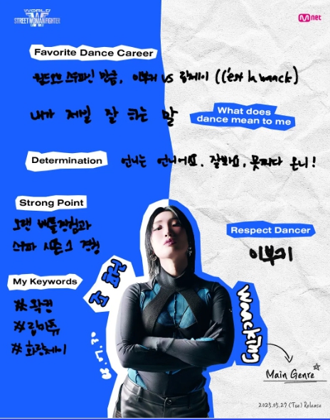 - 경력: 프라우드먼(PROWDMON) 리더 / 스우파 시즌1 준우승 / 대학 강의 및 안무 디렉터 / 방송·광고·공연 다수 출연
