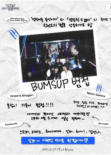 범접(BUMSUP)은 그 이름처럼 범접할 수 없는 실력과 존재감을 지닌 댄서들의 집합체입니다. 각 멤버는 자신만의 색과 경력을 바탕으로 팀 전체의 퍼포먼스를 한층 더 풍성하게 만듭니다. K-POP과 스트릿 댄스의 경계를 허물며 세계 무대를 향해 나아가는 이들의 행보는, 단순한 무대를 넘어 '문화' 그 자체로 기록될 것입니다. 앞으로도 범접 팀의 활약을 기대하며, 이들의 멋진 여정을 응원합니다.