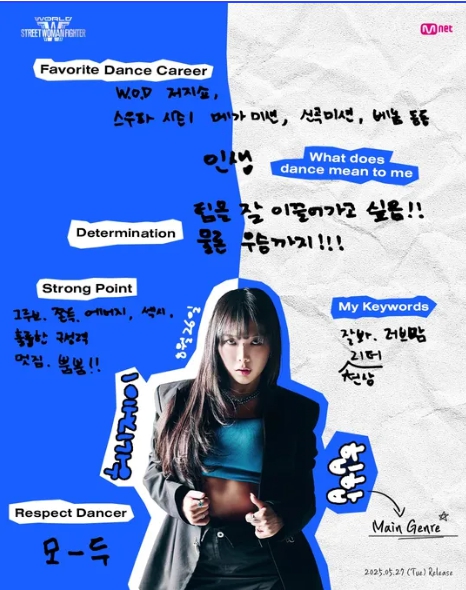- 경력: 프라우드먼(PROWDMON) 리더 / 스우파 시즌1 준우승 / 대학 강의 및 안무 디렉터 / 방송·광고·공연 다수 출연