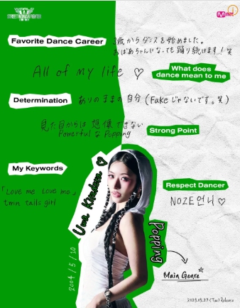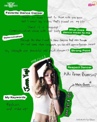 다수의 댄스 아카데미에 출강하며 수많은 아이돌 연습생들을 지도한 베테랑 강사이기도 합니다. 스우파3에서는 감정선 중심의 몰입도 높은 퍼포먼스로 깊은 인상을 남기고 있습니다.