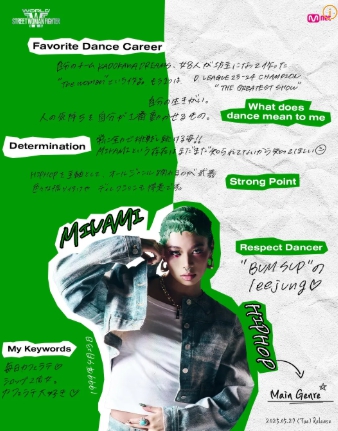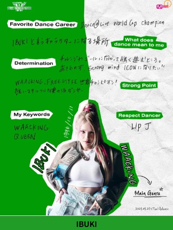 일본 힙합 댄스계에서 손꼽히는 테크니션이자 퍼포머입니다. 음악의 박자를 세밀하게 쪼개 해석하는 능력은 세계 무대에서도 인정받고 있습니다. 쿨한 외면과는 달리 무대 위에서는 누구보다 뜨겁고 열정적인 댄서입니다.
