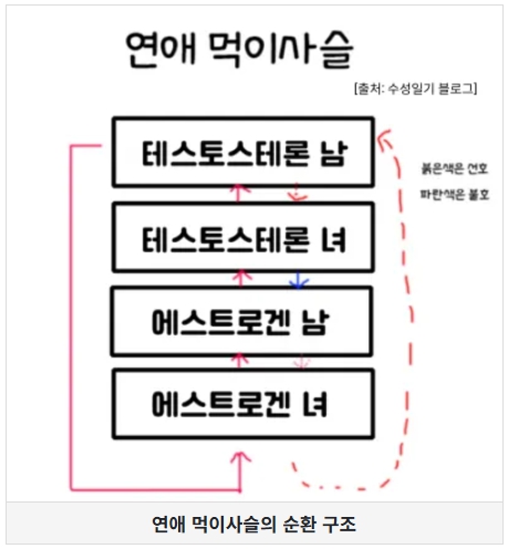 연애는 단순히 '좋아하는 사람과 만나서 사랑을 나누는 것'만으로 설명할 수 없습니다. 누군가는 상대의 리드에 끌리고, 누군가는 감정을 안정시켜줄 사람을 찾으며, 또 어떤 사람은 강한 주도권을 쥐고 관계를 이끌어가려 합니다. 이런 관계의 흐름은 각자의 성격, 감정 패턴, 그리고 생물학적 호르몬 성향에 의해 결정되며, 이 흐름은 특정한 '순환 구조'를 만들어냅니다. 바로 '연애 먹이사슬 이론'입니다.