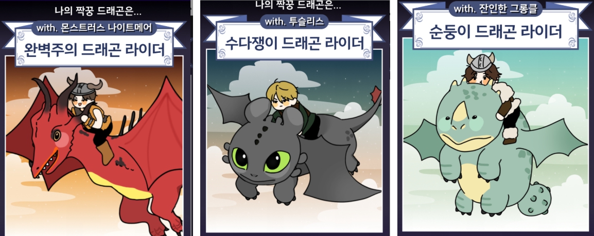 해당 테스트는 간단한 심리 질문에 답하면, 나의 성향과 가장 잘 맞는 드래곤 파트너를 매칭해주는 방식인데요.