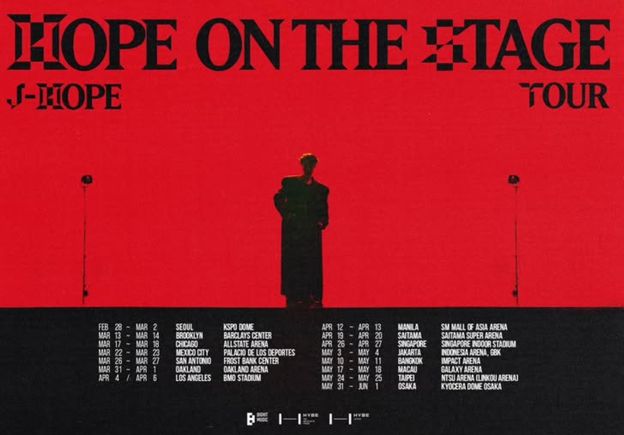 제이홉은 6월 28일부터 서울 올림픽공원 KSPO돔에서 단독 콘서트 ‘HOPE ON THE STAGE’를 시작으로 첫 솔로 월드투어에 돌입하며, 미국, 멕시코, 필리핀, 일본 등 총 15개 도시를 순회할 예정입니다.